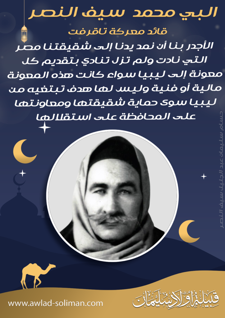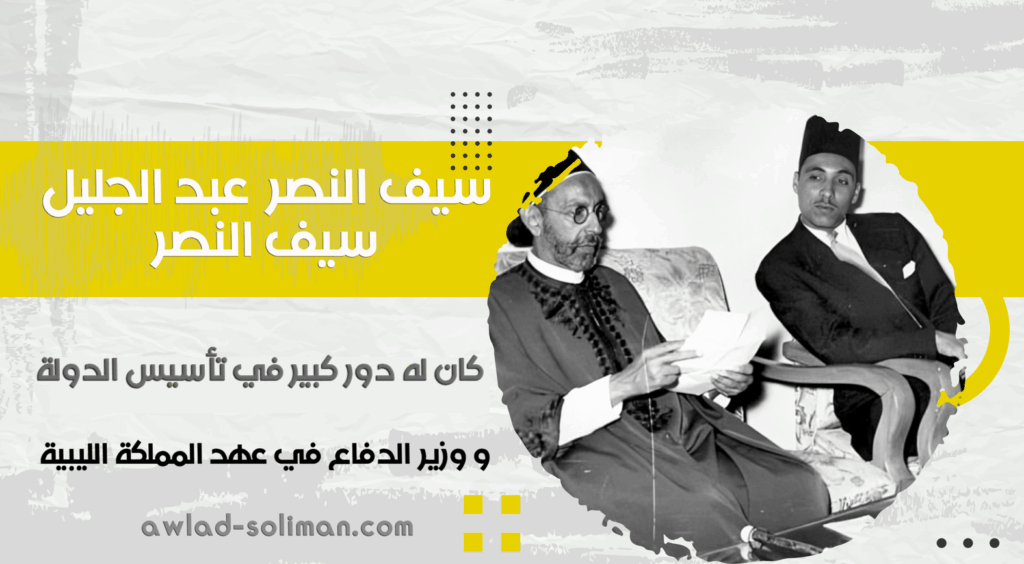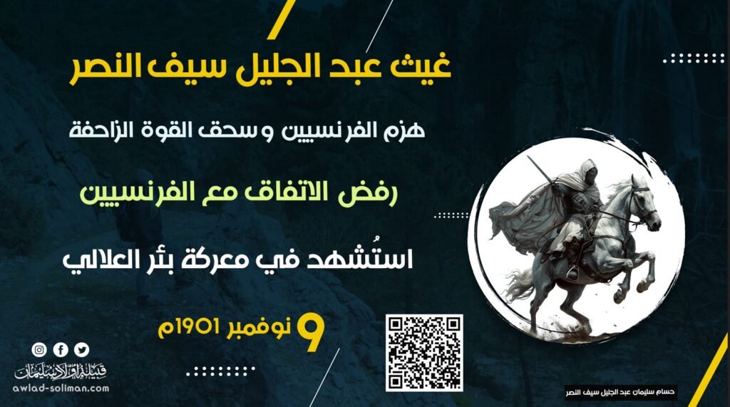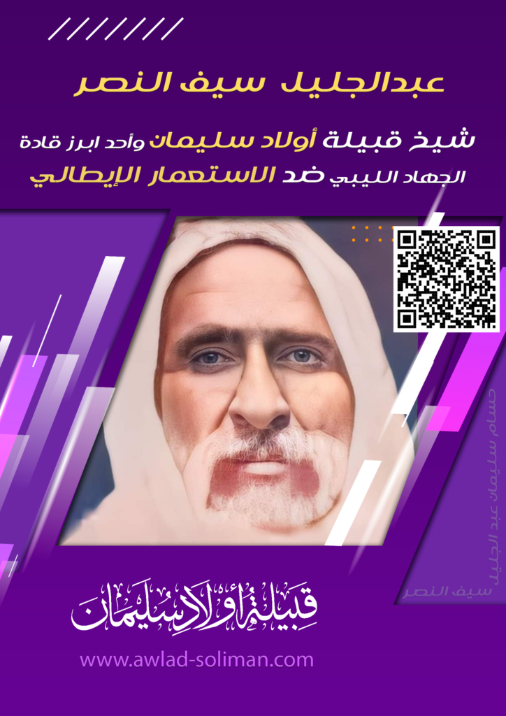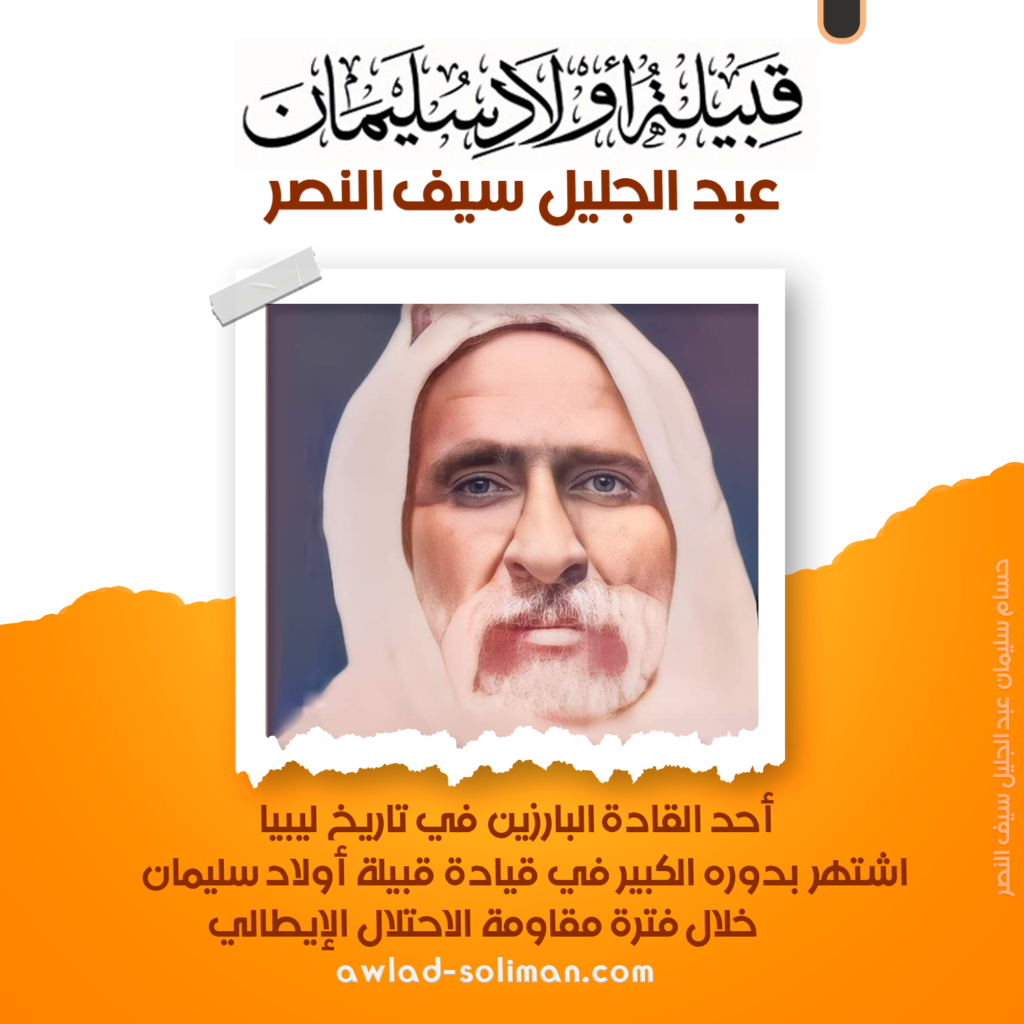 عائلة سيف النصر: كاسرة جيوش فرنسا 1899م و إيطاليا 1911م غيث عبد الجليل سيف النصر شيخ قبيلة أولاد سليمان المقيمة في منطقة كانم (تشاد حالياً)، وأحد أبرز القادة الذين واجهوا التوسع الفرنسي في أواخر القرن التاسع عشر.مع دخول القوات الفرنسية المنطقة عام 1899، تصدّى غيث عبد الجليل سيف النصر للهجوم وقاد القبائل في مواجهات شرسة، […]
